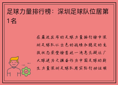 在最近发布的足球力量排行榜中,深圳足球队以出色的战绩和稳定的竞技状态荣登榜首,这一消息无疑让广大球迷为之振奋。作为中国足球的新生力量,深圳足球队用实际行动证明了自己的实力,也为中国足球的发展注入了新鲜血液。榜单不仅以胜率、进球数和防守能力为评判标准,更综合考量了球队的战术执行力、球员默契以及整体精神面貌,而深圳队在这些方面均表现出色,赢得了评审团的高度认可。 近年来,深圳足球队不断加大投入,注重青训建设和战术升级。他们不仅引进了一批具备国际水平的球员,还坚持本土化培养策略,使年轻球员在实战中快速成长。正是这种“国际视野+本土实践”的结合,让深圳队在国内联赛中稳步提升竞争力,也为球队长期发展奠定了坚实基础。除此之外,深圳足球队在比赛中展现出的团队精神和顽强意志也成为其夺冠的重要因素。无论面对何种强敌,队员们都能保持冷静、精确执行战术,这种高水平的专业素养让他们在激烈的赛场上脱颖而出。 值得一提的是,深圳队在球迷文化建设上同样走在前列。球队深知足球不仅是竞技运动,更是一种文化和情感的纽带。他们通过线上互动、球迷活动和社区参与,让球迷真正融入球队,形成了强大的精神支持力。正是这种球迷与球队之间的深厚情感,使得深圳队在比赛中如虎添翼,每一次进球和胜利都凝聚了无数人的热情与期待。 从技术层面来看,深圳队在进攻端的创新打法和防守端的稳定性都非常突出。球队善于利用快速反击和高位压迫相结合的战术,使对手难以招架。中场球员的传球视野和前锋的精准射门形成完美配合,让深圳队在对阵强队时也能占据主动。防守方面,球队门将和后卫形成了密不可破的防线,多次在关键比赛中成功化解对手的威胁,显示出极高的防守执行力。 深圳足球队位居力量排行榜第一,既是对过去努力的肯定,也是未来更高目标的起点。他们用实力告诉所有人:在中国足球的舞台上,年轻的力量同样可以闪耀光芒。随着赛季的深入,深圳队有望继续保持强势表现,为球迷带来更多精彩瞬间,也为中国足球注入更多信心和希望。 深圳足球队的成功不仅仅体现在战绩上,更是一种体系化管理和长远规划的体现。球队管理层高度重视科学化训练,通过数据分析、运动医学以及心理辅导等手段提升球员整体素质。每一名球员都接受个性化训练计划,既强化体能,又提升技术能力,使球队在高强度比赛中保持良好状态。深圳队还积极学习国际先进战术理念,将战术布置与球员特点紧密结合,实现最大化战斗力。 年轻球员的培养是深圳足球队另一个显著优势。球队建立了完善的青训体系,从基础技术到心理素质,从团队协作到战术执行,全面提升青年球员的竞技能力。许多年轻球员在短时间内成长为核心力量,不仅为球队注入新活力,也成为深圳队在国内联赛中持续领先的重要保障。这种注重年轻力量的策略,让深圳队拥有持久的竞争力,确保未来多个赛季都能保持高水平发挥。 深圳队的成功也得益于教练团队的精心指导。教练组不仅在技战术上进行深入研究,还注重球员心理调节和团队凝聚力建设。无论是赛前分析对手、赛中指挥战术,还是赛后总结复盘,教练组始终保持高度专业和前瞻性。这种系统化管理让球队能够在不同环境下灵活应对,保持强大的竞争优势。 在球迷和社会层面,深圳足球队同样展现出极高的号召力。球队通过举办球迷见面会、公益活动及校园足球推广,让足球文化深入人心,形成广泛的社会影响力。这不仅增强了球队与球迷之间的情感联系,也为中国足球的普及和发展起到了积极推动作用。每一场比赛,球迷们的呐喊和支持都成为深圳队冲锋的动力,使球队在赛场上更具韧性和斗志。 深圳足球队之所以能够位居足球力量排行榜第1名,绝非偶然。这背后是科学管理、战术创新、青训建设以及团队精神的综合体现。未来,随着更多年轻球员的加入和战术的不断优化,深圳队有望在国内乃至国际赛场上取得更加辉煌的成绩。他们的崛起不仅是深圳足球的荣耀,更象征着中国足球正在迎来新纪元。深圳队用实力证明,中国足球力量正在迅速积聚,他们的每一次进球、每一场胜利都将成为中国足球历史上的光辉篇章。