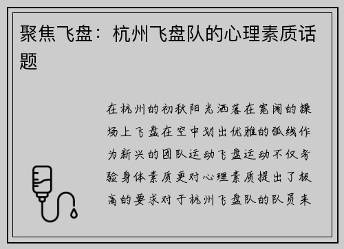 在杭州的初秋,阳光洒落在宽阔的操场上,飞盘在空中划出优雅的弧线。作为新兴的团队运动,飞盘运动不仅考验身体素质,更对心理素质提出了极高的要求。对于杭州飞盘队的队员来说,每一次传接、每一次冲刺,都不仅仅是技术的比拼,更是心理抗压能力的体现。 心理素质在飞盘运动中具有决定性作用。飞盘是一项快速、灵活、需要高度协作的运动。比赛中,队员必须在瞬息万变的局势下做出正确判断,如果心理素质不够稳定,哪怕是技术再高超的运动员,也可能因为紧张或焦虑而出现失误。杭州飞盘队的教练曾经指出,心理训练和体能训练同样重要,有时甚至更关键。 飞盘比赛中,压力来自多个方面:对胜负的渴望、观众的注视、队友的期望,甚至是自我设定的目标。这些压力如果不能被合理疏导,很容易导致运动员出现“过度紧张”或者“比赛恐惧”。为了帮助队员应对这些压力,杭州飞盘队特别重视心理素质训练。在训练中,他们会通过模拟比赛、角色扮演、情境压力测试等方式,让队员在近似真实比赛的环境中锻炼心理承受力。 飞盘运动强调团队协作,而良好的心理素质也是团队默契的核心。队员之间需要在高速运动中保持沟通,理解彼此的战术意图,这要求每个人都具备冷静判断和快速调整的能力。杭州飞盘队在日常训练中,会通过小组讨论、心理辅导和团队建设活动,培养队员的心理韧性和团队责任感。队员们在一次次训练和比赛中学会如何面对挫折、如何控制情绪,从而在关键时刻做出最佳选择。 心理素质的提升不仅仅是为了赢得比赛,它还能够帮助队员在生活中更好地应对压力。很多队员表示,飞盘运动让他们学会了如何在紧张环境中保持冷静,如何与他人协作,以及如何在失败中总结经验。可以说,杭州飞盘队的心理训练不仅塑造了优秀的运动员,也塑造了更加坚韧、自信的个体。 在深入探讨心理素质训练的具体方法之前,先来了解一下飞盘运动独特的心理挑战。飞盘的高速传递和快速跑动要求队员具备瞬时判断力和高度专注力。每一次接盘和传盘都需要在极短时间内评估空间、速度、队友位置及对手动态,这对心理素质提出了极高要求。杭州飞盘队通过多种训练手段来强化队员的心理韧性。 其中,视觉化训练是一种常用的方法。教练会引导队员在脑海中模拟比赛场景,预设各种突发状况,如突如其来的防守干扰、关键时刻的传盘压力等。通过不断练习,队员在真实比赛中能够更快适应环境变化,从容应对挑战。呼吸训练和正念冥想也被广泛应用,以帮助队员在高压情况下保持冷静,控制紧张情绪。 心理素质不仅体现在个人能力上,还与团队氛围密切相关。杭州飞盘队强调心理安全感,队员之间鼓励相互支持、相互信任。教练常说:“一个心理健康、互相信任的团队,才能在比赛中发挥出1+1>2的效果。”因此,团队建设活动、集体心理辅导成为训练的重要组成部分。通过这些活动,队员学会了在失败后互相鼓励,在胜利时不自满,这种心理素质的培养,使整个团队在面对强敌时能够保持稳定心态。 不可忽视的是,心理素质的培养是一个长期过程。杭州飞盘队在每个赛季都会安排心理训练课程,并结合实际比赛不断调整策略。队员们在训练中不断挑战自我,突破心理障碍,从而在比赛中表现得更加稳定、果断。对于年轻队员来说,这不仅增强了竞技水平,也让他们在面对学业、工作及生活压力时更具韧性。 杭州飞盘队的心理素质建设是一套完整的系统工程,包括压力管理、情绪控制、团队信任以及心理适应力的训练。心理素质不仅决定了比赛表现,也塑造了队员的整体素质和人格魅力。随着飞盘运动在国内的普及,越来越多的人开始关注运动员心理素质的重要性,而杭州飞盘队无疑为这种理念提供了生动的实践范例。通过科学的心理训练,队员们不仅在赛场上更加出色,也在生活中更具自信和韧性。
